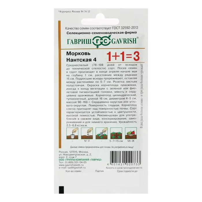Семена Морковь 1+1 "Нантская 4", 4,0 г — Характеристики