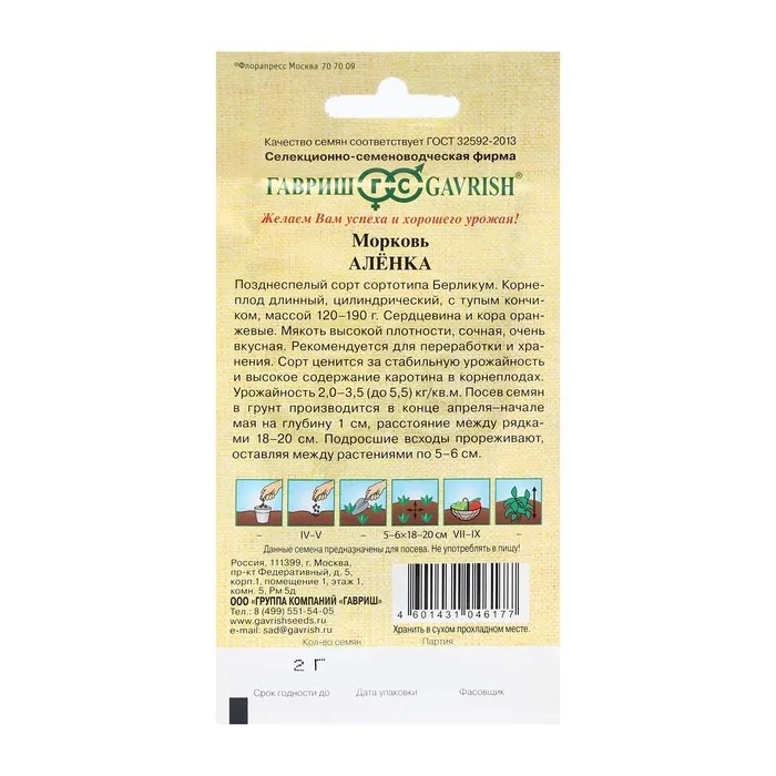 Позднеспелый сорт сортотипа Берликум. Корнеплод длинный, цилиндрический с тупым кончиком, массой 120-190 г. Сердцевина и кора оранжевые. Мякоть высокой плотности, сочная, очень вкусная. Рекомендуется для переработки и хранения. Сорт ценится за стабильную урожайность и высокое содержание каротина в корнеплодах. Урожайность 2,0-3,5 (до 5,5) кг/м2. Посев семян в грунт производится в конце апреля – начале мая на глубину 1 см, расстояние между рядками 18-20 см. Подросшие всходы прореживают, оставляя между растениями по 5-6 см.