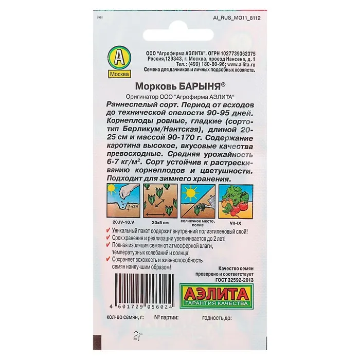 «Барыня» — это раннеспелый сорт моркови, который имеет высокую урожайность (6–7 кг/м²), устойчивость к растрескиванию корнеплодов и цветушности. Овощи вырастают гладкими, ровными и с маленькой сердцевиной. Период от всходов до технической спелости составляет 90–95 дней.