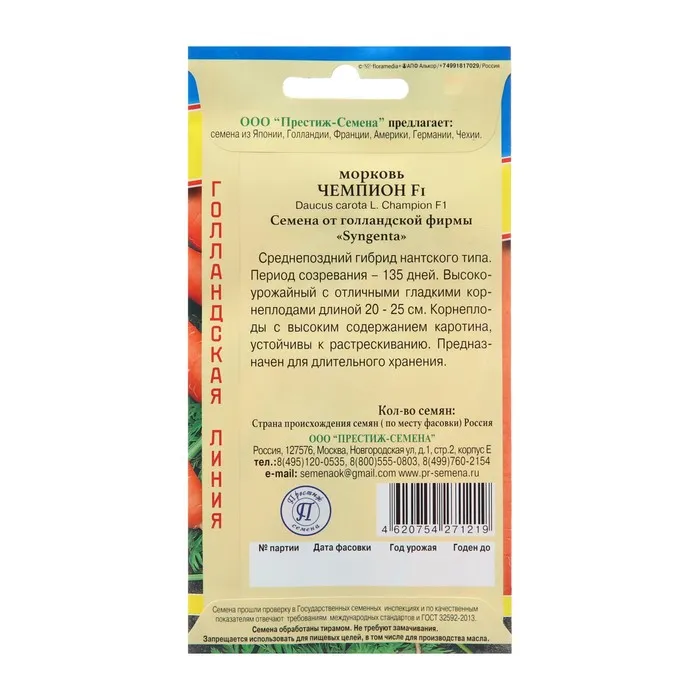 Семена Морковь "Чемпион" F1, 0.5 г — Характеристики