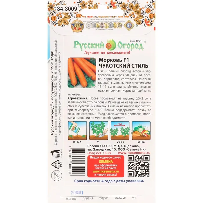 Очень ранний гибрид, готов к употреблению через 90 дней от посева. Корнеплод сортотипа Нантская, с маленькими чечевичками, 15-17 см в длину. Корневая шейка не зеленеет.