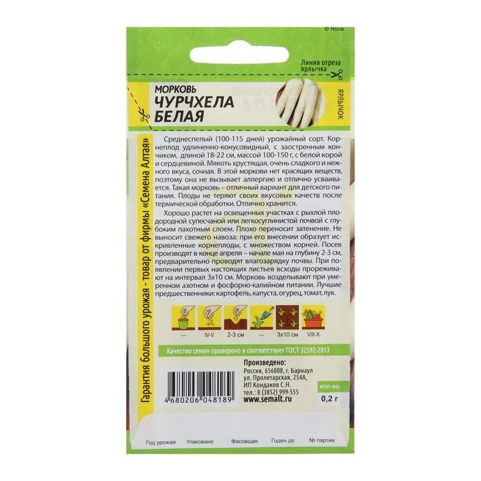 Среднеспелый (100-115 дней) урожайный сорт. Корнеплод удлиненно-конусовидный, с заостренным кончиком, длинной 18-22 см, массой 100-150 г, с белой корой и сердцевиной. Мякоть хрустящая, очень сладкого и нежного вкуса, сочная. В этой моркови нет красящих веществ, поэтому она не вызывает аллергию и отлично усваивается. Такая морковь – отличный вариант для детского питания. Плоды не теряют своих вкусовых качеств после термической обработки. Отлично хранится. Хорошо растёт на освещённых участках с рыхлой плодородной супесчаной или легкосуглинистой почвой с глубоким пахотным слоем. Плохо переносит затенение. Не выносит свежего навоза: при его внесении образует искривленные корнеплоды, с множеством корней. Посев производят в конце апреля – начале мая на глубину 2-3 см, предварительно проводят влагозарядку почвы. При появлении первых настоящих листьев всходы прореживают на интервал 3х10 см. Морковь возделывают при умеренном азотном и фосфорно-калийном питании. Лучшие предшественники: картофель, капуста, огурец, томат, лук.