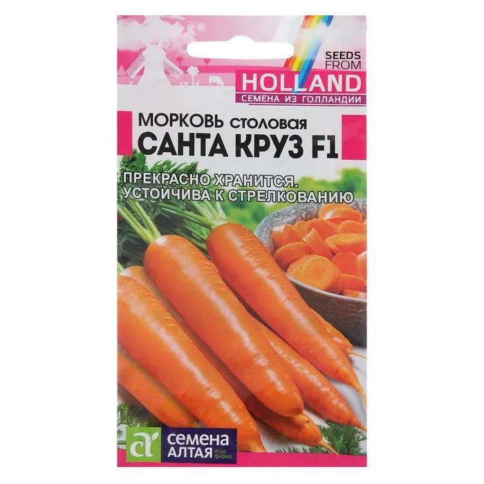 Среднеспелый (80-100 дней) урожайный сорт. Корнеплоды конусовидные, остроконечные, выровненные, длиной до 20 см , ярко-фиолетовой окраски с оранжевой сердцевиной. Мякоть хрустящая, сладкая, сочная, очень аппетитная, с ярким ароматом, содержит большое количество бета-каротина, витаминов А и К, фолиевой кислоты, микроэлементов. Фиолетовая окраска обусловлена наличием в мякоти антоцианов – природных антиоксидантов. Сорт устойчив к цветушности и растрескиванию корнеплодов, прекрасно хранится длительное время. Рекомендуется для приготовления свежих салатов, борщей и винегретов, при замораживании сохраняет оригинальный цвет и аромат. Хорошо растёт на освещённых участках с рыхлой плодородной супесчаной или легкосуглинистой почвой с глубоким пахотным слоем. Плохо переносит затенение. Не выносит свежего навоза: при его внесении образует искривленные корнеплоды, с множеством корней. Посев производят в конце апреля – начале мая на глубину 2-3 см, предварительно проводят влагозарядку почвы. При появлении первых настоящих листьев всходы прореживают на интервал 3х10 см. Морковь возделывают при умеренном азотном и фосфорно-калийном питании. Лучшие предшественники: картофель, капуста, огурец, томат, лук.