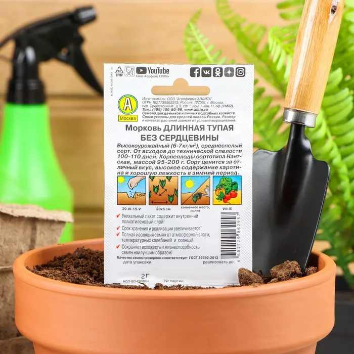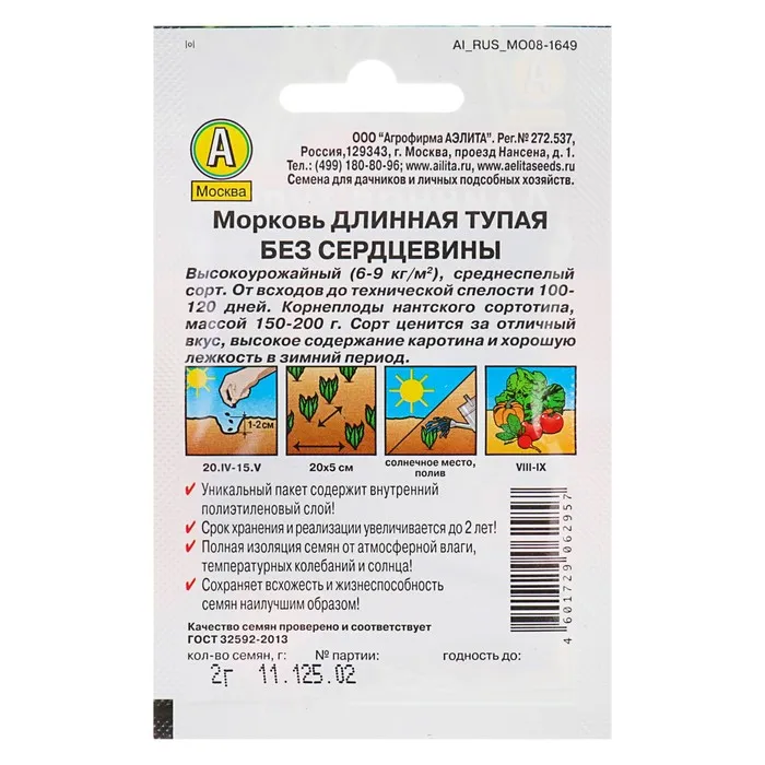 Высокоурожайный (6-9 кг/м2), среднеспелый сорт. От всходов до технической спелости 100-120 дней. Корнеплоды нантского сортотипа, массой 150-200 г. Сорт ценится за отличный вкус, высокое содержание каротина и хорошую лежкость в зимний период.