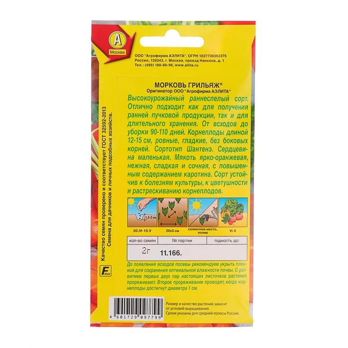 Высокоурожайный среднеспелый сорт. Период от всходов до хозяйственной годности 90-110 дней. Корнеплоды конические (сортотип Шантенэ), длиной 12-15 см, массой 150-250 г, с маленькой сердцевиной, не растрескиваются. Мякоть оранжевая, нежная, великолепного вкуса, с повышенным содержанием каротина. Рекомендуется для потребления в свежем виде и кулинарной переработки. Корнеплоды отлично транспортируются и хранятся в зимний период.