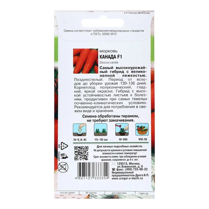 Позднеспелый (120-135 дней от всходов до технической спелости) гибрид голландской селекции. Посев семян в грунт производится в конце апреля - начале мая на глубину 1 см, расстояние между рядками 15 см. Подросшие всходы прореживают, оставляя между растениями по 5-7 см. Розетка листьев полустоячая. Корнеплод полуконический, гладкий, с ярко оранжевой окраской, длиной 20-25 см, диаметром 4-5 см. Корнеплод почти полностью погружен в почву. Масса корнеплода 80-140 г. Гибрид характеризуется устойчивостью к цветушности, высокой лежкостью. Обладает высокой устойчивостью листьев к болезням, продуктивен при самых тяжелых почвенно-климатических условиях. Рекомендован для потребления в свежем виде и хранения. Урожайность 5,5-7,6 кг/м2.