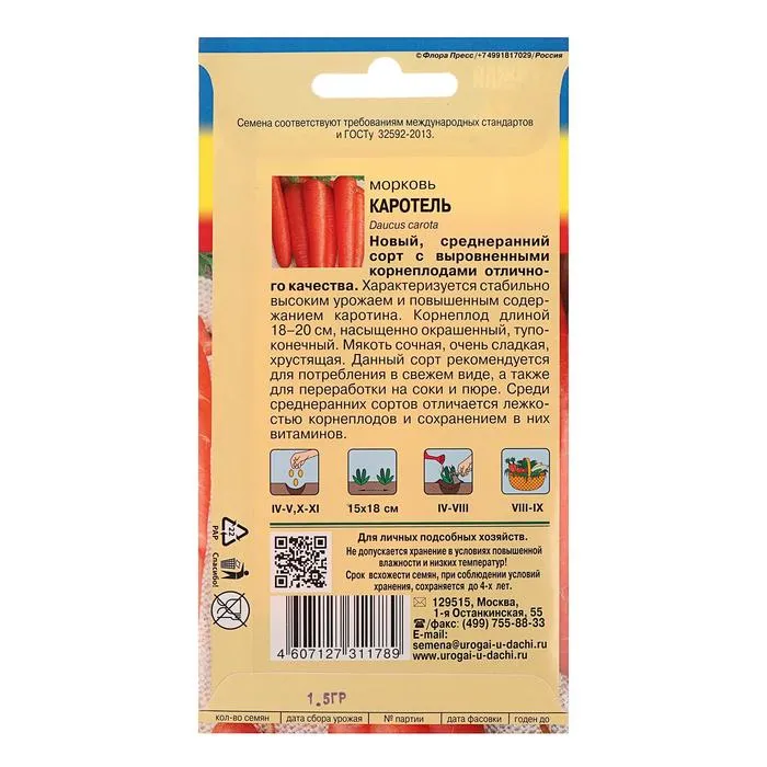 Новый, среднеранний сорт с выровненными корнеплодами отличного качества. Характеризуется стабильно высоким урожаем и повышенным содержанием каротина. Корнеплод длиной 18-20 см, насыщенно окрашенный, тупоконечный. Мякоть сочная, очень сладкая, хрустящая. Данный сорт рекомендуется для потребления в свежем виде, а также для переработки на соки и пюре. Среди среднеранних сортов отличается лежкостью корнеплодов и сохранением в них витаминов.