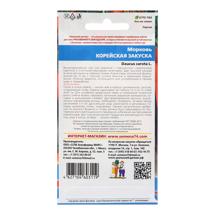 Семена Морковь «Корейская Закуска», 2 г, «Уральский дачник» — Характеристики