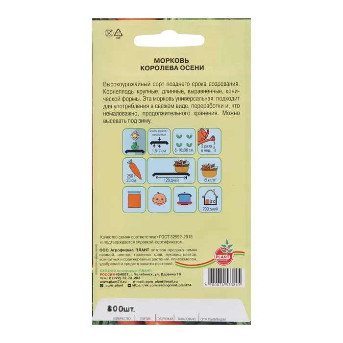 Позднеспелый (от всходов до технической спелости корнеплодов 120-130 дней) сорт. Корнеплоды конические, со слегка заостренным кончиком, длиной 20-25 см, массой 60-180 (до 250) г. Мякоть оранжево-красная, сочная, нежная, сладкая. Урожайность до 3,8-9 кг/м². Ценность сорта: устойчивость к растрескиванию и цветушности, дружное формирование и выравненность корнеплодов, пригодность для длительного хранения. Рекомендуется для употребления в свежем виде и всех видов переработки.