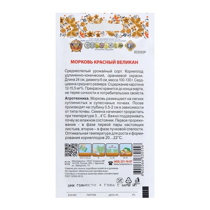 Семена Морковь "Красный великан", серия Русский огород, 2 г — Характеристики