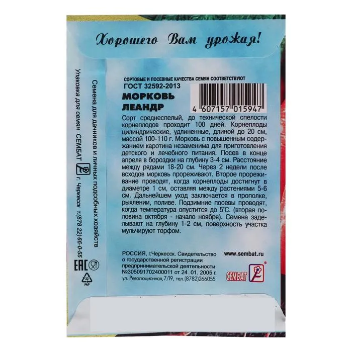 Среднеспелый сорт. Розетка листьев полупрямостоячая, лист средний до длинного, зеленый, сильнорассеченный.. Корнеплоды выравненные, цилиндрические с тупым кончиком, оранжевые, гладкие, длиной 20 см, массой 75-120 г, полностью погружены в почву. Сердцевина небольшая, желто-оранжевая. Вкусовые качества хорошие. Ценность сорта: устойчивость к растрескиванию корнеплодов, стабильная урожайность, высокое содержание каротина, отличная лежкость (до 8-9 месяцев). Рекомендуется для употребления в свежем виде, приготовления соков, кулинарной переработки и замораживания. Устойчив к растрескиванию корнеплодов, к белой и серой гнили.