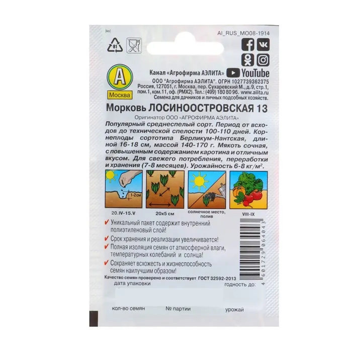 «Лосиноостровская 13» — это среднеспелый сорт, у которого период от всходов до технической спелости составляет 90– 100 дней. Она имеет цилиндрическую форму, слабо сужающуюся к основанию, а также содержит повышенное количество каротина. Корнеплод достигает в длину 16–18 см и весит 160–170 г.