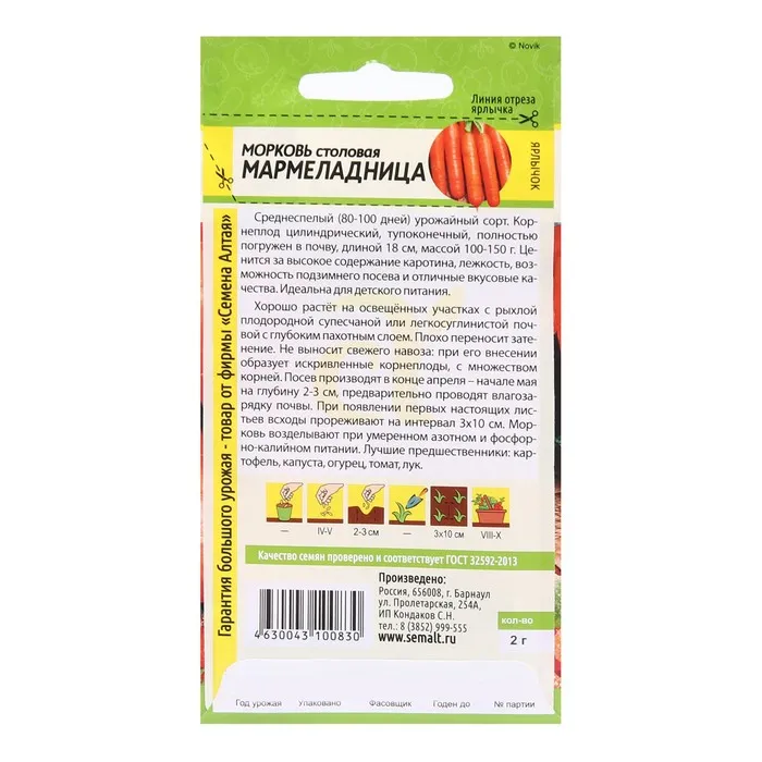 Сорт для любителей сочной и сладкой моркови! Среднего срока созревания (100-115 дней), с крупной розеткой листьев, сортотип Нантская. Корнеплоды цилиндрические, тупоконечные, длиной 20-22 см, с гладкой поверхностью, массой 90-140 г. Окраска оранжево-красная, благодаря высокому содержанию каротина, мякоть сочная, сладкая, с небольшой сердцевиной. Хорошо растёт на освещённых участках с рыхлой плодородной супесчаной или легкосуглинистой почвой с глубоким пахотным слоем. Плохо переносит затенение. Не выносит свежего навоза: при его внесении образует искривлённые, с множеством корней кор-неплоды. Морковь потребляет мало азота, поэтому её возделывают при умеренном азотном и обильном калийно-фосфорном питании. Лучшие предшественники — картофель, капуста, огурец, томат, лук.