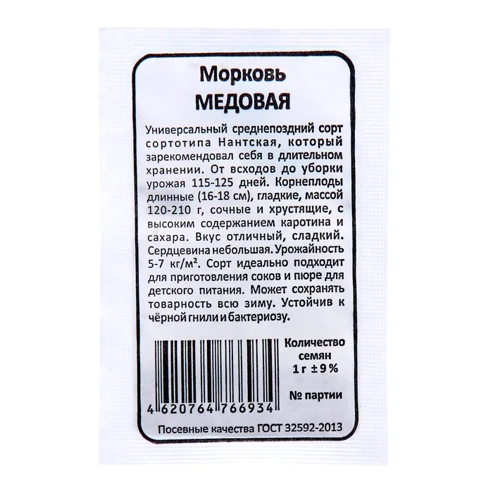 Универсальный среднепоздний сорт. От всходов до уборки 115-125 дней. Корнеплоды длинные, нантского сортотипа, массой 120-210 г. Сердцевина маленькая. Вкус сладкий. Содержание общего сахара – до 10%, каротина – до 12 мг на 100 г сырого вещества. Подходит для приготовления соков и пюре для детского питания. Сорт устойчив к черной и бактериальной пятнистости. Урожайность – 5-7 кг/м2.