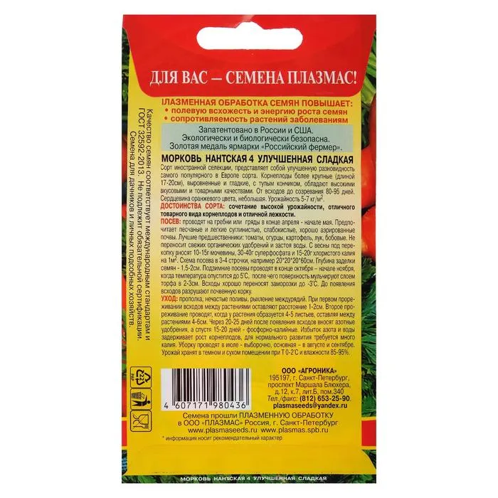Семена Морковь "Нантская 4", улучшенная сладкая, 1,5 г — Характеристики