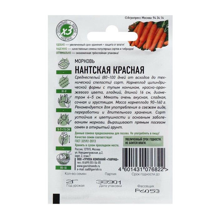 Семена Морковь «Нантская красная», 1.5 г, «Удачные семена» — Характеристики