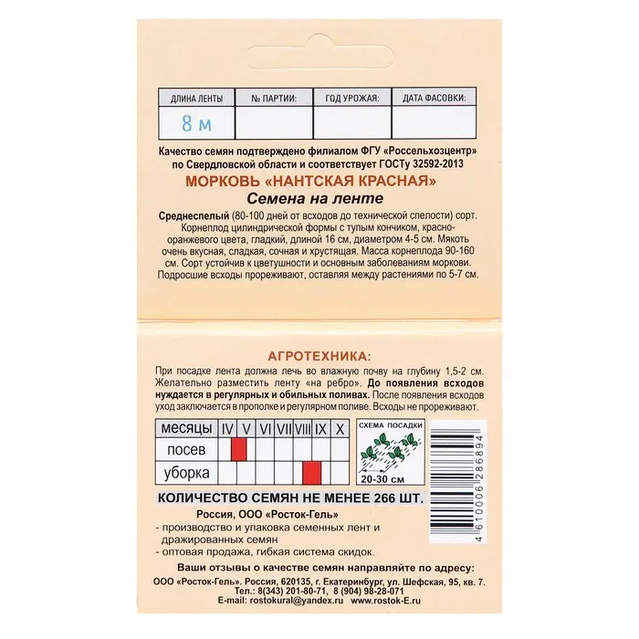 Семена Морковь "НАНТСКАЯ КРАСНАЯ", 260 шт, ЛЕНТА 8 М — Характеристики