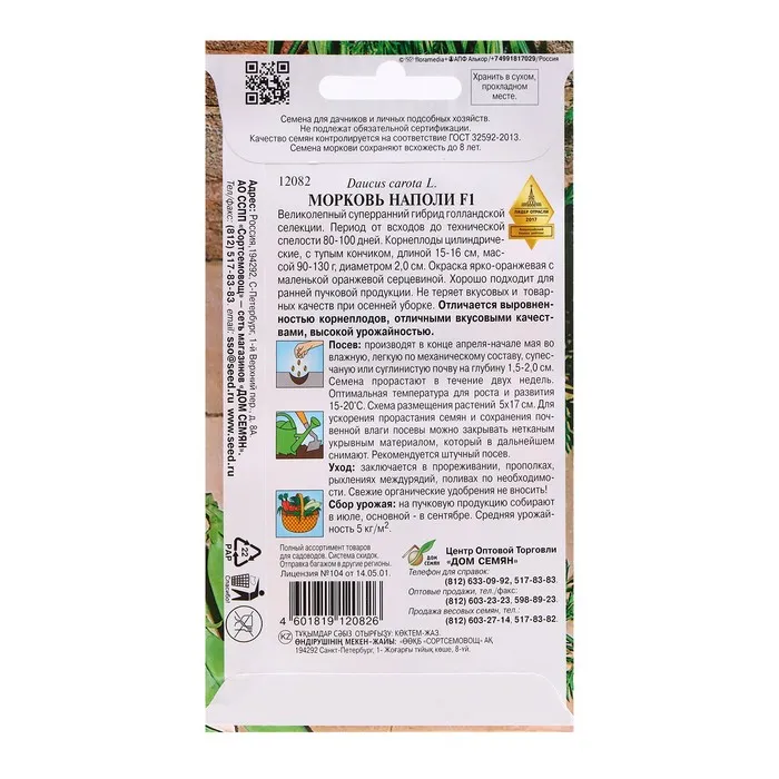 Семена Морковь Наполи F1. Насыщенный цвет и сладкий вкус. Корнеплоды насыщенного цвета и сладкого вкуса. Скороспелый гибрид. Сортотип Нантская. Период от всходов до уборки урожая 90-100 дней. Корнеплод цилиндрической формы, слегка сбегающий на конус, ярко-оранжевой окраски. Длина 19-21 см, масса 120-180 г. Ботва крепкая, темно-зеленая. Вкусовые качества отличные. Рекомендуется для потребления в свежем виде.