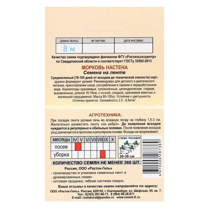 Среднеспелый (76-105 дней от всходов до технической спелости) сорт, дружно формирует урожай. Рекомендован для детского и диетического питания, приготовления соков, употребления в свежем и переработанном виде. Посев семян в грунт производится в конце апреля – начале мая на глубину 1 см, расстояние между рядками 15 см. Подросшие всходы прореживают, оставляя между растениями по 5-7 см. Корнеплоды оранжевые, цилиндрические, тупоконечные, гладкие, выравненные, длиной 16-18 см, с сочной сладкой оранжевой мякотью и маленькой сердцевиной. Масса 80-150 г. Устойчив к цветушности. Отлично хранится. Урожайность 2,5-6,6 кг/м2.