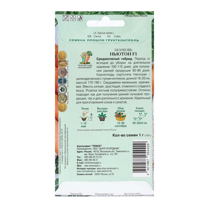 Среднеспелый гибрид. Период от всходов до уборки на длительное хранение 100-110 дней, для получения ранней продукции 80-90 дней. Корнеплоды сортотипа Нантская – цилиндрические с тупым кончиком, длиной 18-20 см, массой 170-190 г. Сердцевина маленькая, оранжевая. Мякоть сочная, хрустящая, отменного сладкого вкуса. Розетка листьев полупрямостоячая. Отлично подходит как для получения ранней пучковой продукции, так и для длительного хранения. Идеальный для приготовления соков и салатов.