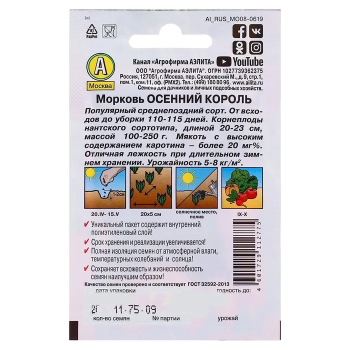 Благодаря внутреннему полиэтиленовому слою пакет не пропускает влагу и увеличивает срок годности семян до 2 лет.