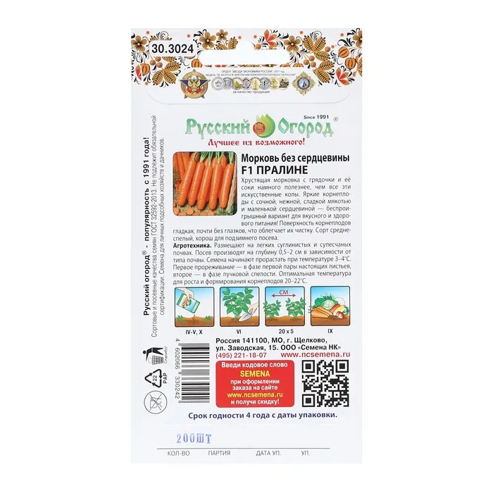 Семена Морковь "Пралине", 200 шт. — Характеристики