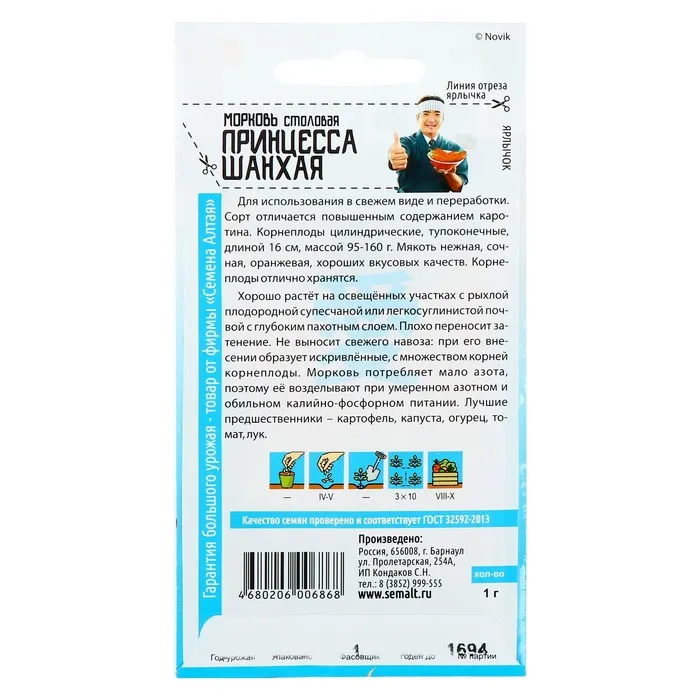 Для использования в свежем виде и переработки. Сорт отличается повышенным содержанием каротина. Корнеплоды цилиндрические, тупоконечные, длиной 16 см, массой 95-160 г. Мякоть нежная, сочная, оранжевая, хороших вкусовых качеств. Корнеплоды отлично хранятся. Хорошо растёт на освещённых участках с рыхлой плодородной супесчаной или легкосуглинистой почвой с глубоким пахотным слоем. Плохо переносит затенение. Не выносит свежего навоза: при его внесении образует искривлённые, с множеством корней корнеплоды. Морковь потребляет мало азота, поэтому её возделывают при умеренном азотном и обильном калийно-фосфорном питании. Лучшие предшественники — картофель, капуста, огурец, томат, лук.