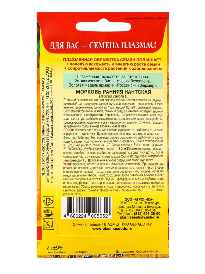 Семена Морковь «Ранняя Нантская», 2 г, «Плазмас» — Характеристики