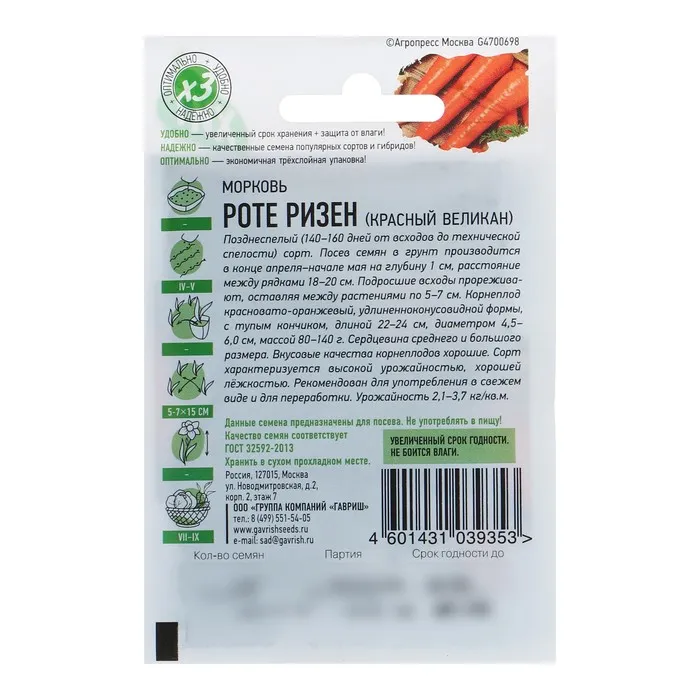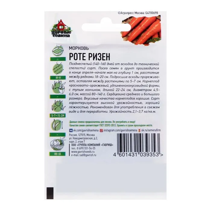Позднеспелый (140-160 дней от всходов до технической спелости) сорт. Посев семян в грунт производится в конце апреля – начале мая на глубину 1 см, расстояние между рядками 18-20 см. Подросшие всходы прореживают, оставляя между растениями по 5-7 см. Корнеплод красновато-оранжевый, удлиненно-конусовидной формы, с тупым кончиком, длиной 22-24 см, диаметром 4,5-6,0 см, массой 80-140 г. Сердцевина среднего и большого размера. Вкусовые качества корнеплодов хорошие. Сорт характеризуется высокой урожайностью, хорошей лежкостью. Рекомендован для потребления в свежем виде и для переработки. Урожайность 2,1-3,7 кг/м2.
