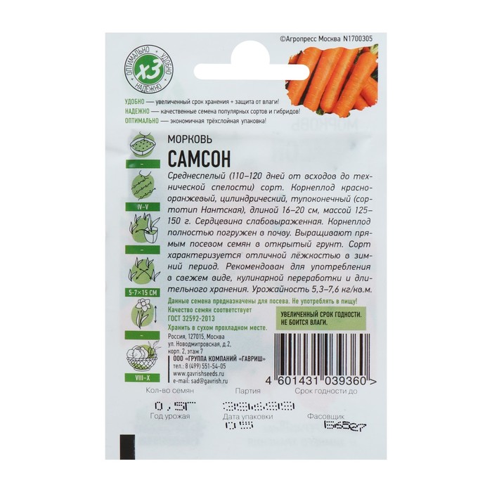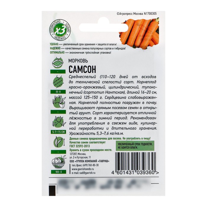 Среднеспелый (100-120 дней от всходов до технической спелости) сорт. Посев семян в грунт производится в конце апреля – начале мая на глубину 1 см, расстояние между рядками 15 см. Подросшие всходы прореживают, оставляя между растениями по 5-7 см. Окраска поверхности, сердцевины и мякоти корнеплода – оранжевая. Корнеплод цилиндрический, тупоконечный, длиной 16 см. Сердцевина слабовыраженная. Корнеплод полностью погружен в почву. Масса корнеплода 100-160 г. Сорт характеризуется отличной лежкостью в зимний период. Рекомендован для потребления в свежем виде, хранения и консервирования. Урожайность 4-7 кг/м2.