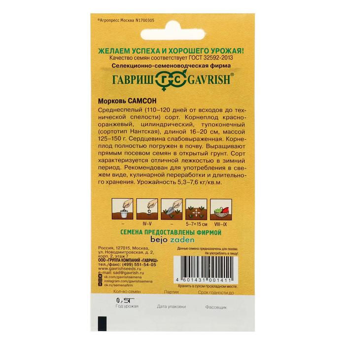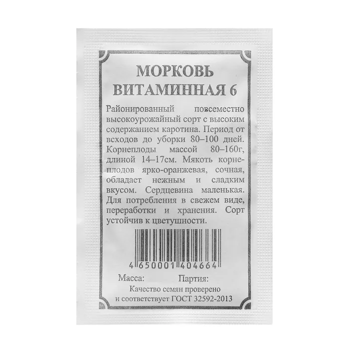 Среднеспелый (110–120 дней от всходов до технической спелости) сорт. Корнеплод красно-оранжевый, цилиндрический, тупоконечный (сортотип Нантская), длиной 16–20 см, массой 125–150 г. Сердцевина слабовыраженная. Корнеплод полностью погружен в почву. Выращивают прямым посевом семян в открытый грунт. Сорт характеризуется отличной лежкостью в зимний период. Рекомендован для употребления в свежем виде, кулинарной переработки и длительного хранения. Урожайность 5,3–7,6 кг/м2.