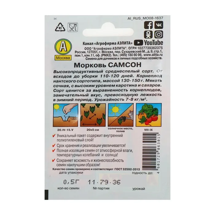 «Самсон» — это неприхотливый среднеспелый сорт моркови, который отличается превосходной лёжкостью. Подходит для употребления в свежем виде, переработки и хранения.