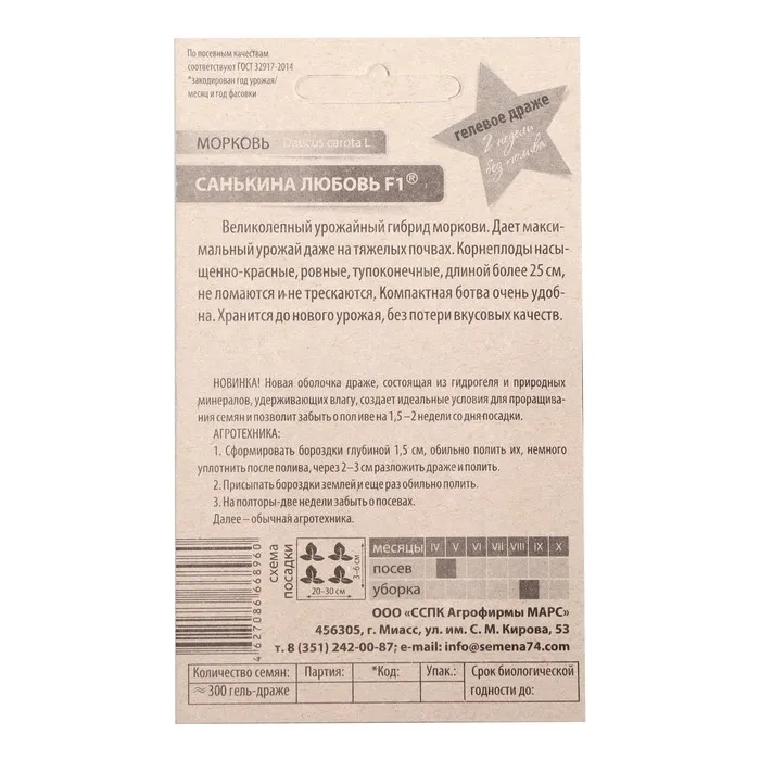 Сорт «Санькина любовь» относится к позднеспелым. Чтобы получить ранний урожай, семена сеют поздней осенью, ориентировочно в ноябре, когда температура не поднимается выше 5 градусов.Морковь имеет насыщенно-оранжевый цвет. Форма тупоконечная, цилиндрическая. Длина корнеплода в среднем 25 см. Вкус сладкий, консистенция хрустящая.Спелую морковь употребляют в свежем виде, а также используют для приготовления вторых блюд, супов и консервирования.Посев моркови «Санькина любовь» проводят в конце апреля — начале мая. Этот сорт любит солнечные места. Грядка должна быть хорошо перекопана и увлажнена. Лучше всего для выращивания моркови подходит плодородная рыхлая земля. Семена углубляют на 1,5-2 см, располагая по схеме 7х20 см. Для сохранения влажности, грядку можно прикрыть укрывным материалом до появления всходов.