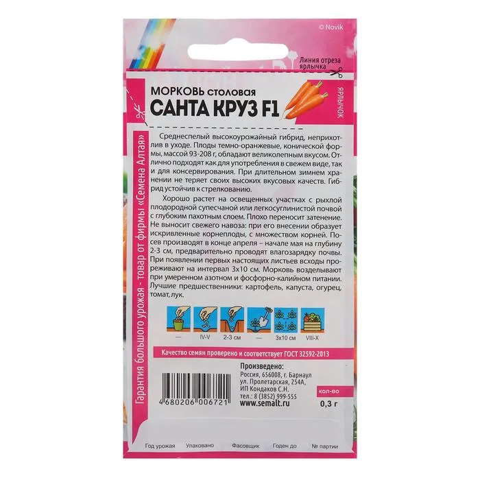 Гибрид для настоящих гурманов! Великолепный высокоурожайный среднеспелый гибрид, неприхотлив в уходе. Плоды темно-оранжевые, конической формы, массой 93-208 г, обладают великолепным вкусом. Отлично подходят как для употребления в свежем виде, так и для консервирования. При длительном зимнем хранении не теряет своих высоких вкусовых качеств. Гибрид устойчив к стрелкованию. Хорошо растёт на освещённых участках с рыхлой плодородной супесчаной или легкосуглинистой почвой с глубоким пахотным слоем. Плохо переносит затенение. Не выносит свежего навоза: при его внесении образует искривленные корнеплоды, с множеством корней. Посев производят в конце апреля – начале мая на глубину 2-3 см, предварительно проводят влагозарядку почвы. При появлении первых настоящих листьев всходы прореживают на интервал 3х10 см. Морковь возделывают при умеренном азотном и фосфорно-калийном питании. Лучшие предшественники: картофель, капуста, огурец, томат, лук.