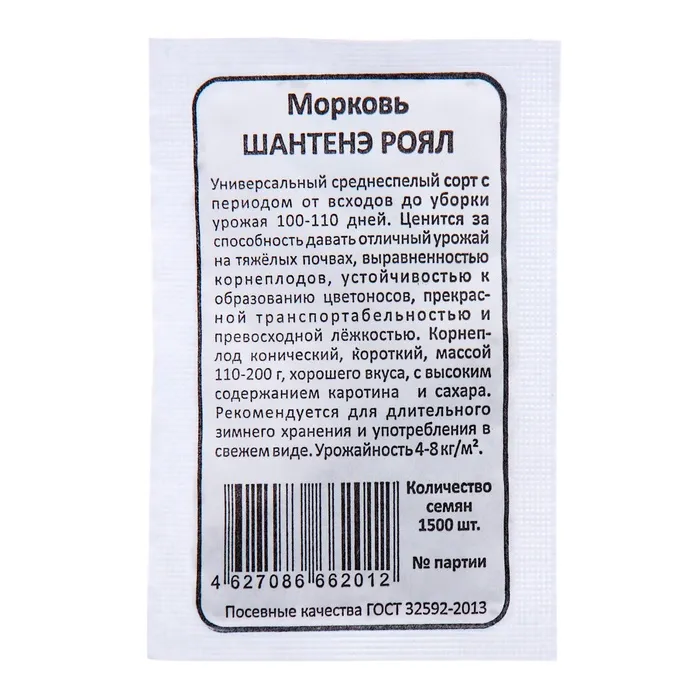 Морковь Шантенэ Роял - среднеранний сорт моркови сортотипа Шантенэ. От полных всходов до технической спелости 120–130 дней. Розетка листьев полупрямостоячая, лист длинный, среднерассеченный, зеленый. Корнеплоды треугольной формы, с тупым, закругленным кончиком, гладкие, оранжевые, головка корнеплода средняя, слегка выступает над поверхностью почвы, не зеленеет и без антоциановой окраски. При выращивании по обычной технологии длина корнеплода 14–16 см, диаметром 4,5–6 см, массой 110–130 г. Сердцевина средняя. Вкусовые качества отличные, мякоть плотная, сочная, сладкая. Товарность и транспортабельность высокие. Сорт моркови Шантенэ Роял устойчив к цветушности. Выход товарной продукции 85–95%. Используется для потребления в свежем виде, консервирования, переработки и хранения 5–6 месяцев. Норма высева 1,0 г/м2. В 1 г – 800–900 семян. Урожайность 8–9 кг/м2.