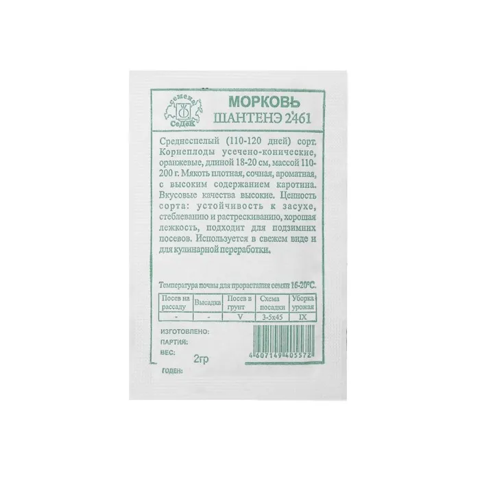 Среднеспелый (85-110 дней от всходов до технической спелости) сорт. Розетка листьев полураскидистая. Корнеплод ярко-оранжевый, конический со слегка заостренным кончиком (сортотип Шантенэ), с повышенным содержанием каротина и сахара. Сердцевина и кора оранжевые. Масса 110-200 г. Сорт характеризуется повышенным содержанием каротина и сахара, выравненностью корнеплодов. Рекомендуется для использования в свежем виде и длительного зимнего хранения. Урожайность 2,0-4,1 кг/м2.