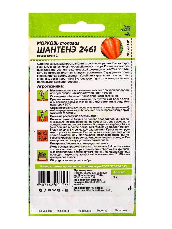 Семена Морковь «Шантенэ 2461», 2 г, «Семена Алтая» — Характеристики