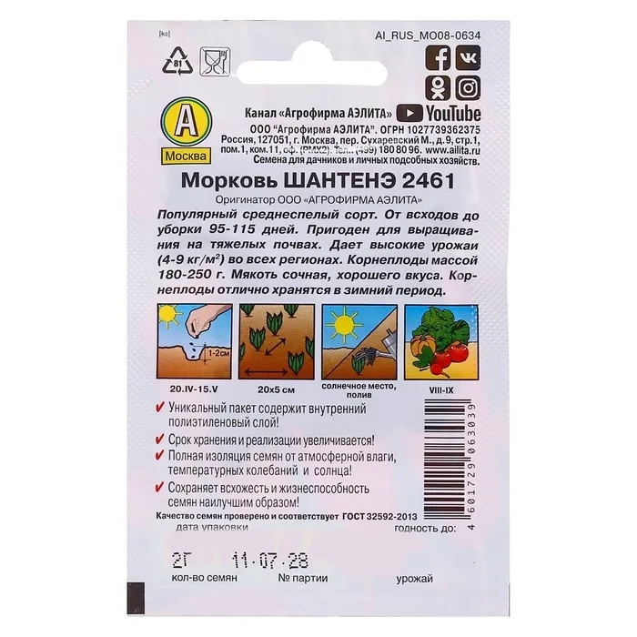 Благодаря внутреннему полиэтиленовому слою пакет не пропускает влагу и увеличивает срок годности семян до 2 лет.