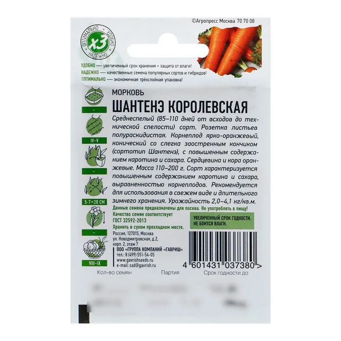 Среднеранний (105-115 дней от всходов до технической спелости) сорт. Посев семян в грунт производится в конце апреля – начале мая на глубину 1 см, расстояние между рядками 15 см. Подросшие всходы прореживают, оставляя между растениями по 5-7 см. Розетка листьев полустоячая. Окраска поверхности, сердцевины и мякоти корнеплода – оранжевая. Корнеплод конический, тупоконечный, длиной 15 см, диаметром 5-6 см, массой 80-250г. Корнеплод полностью погружен в почву. Вкусовые качества высокие. Сорт характеризуется устойчивостью к цветушности. Рекомендован для потребления в свежем виде и переработки. Урожайность 2,0-4,0 кг/м2.
