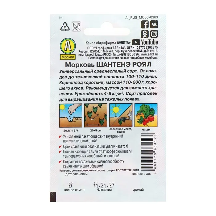 Семена Морковь "Шантенэ Роял" "Лидер", 2 г , — Характеристики
