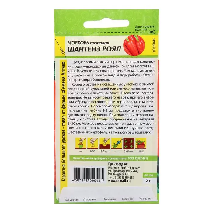 Среднеспелый, лежкий сорт. Корнеплоды конические, оранжево-красные, длиной 15-17 см, массой 110-200 г. Вкусовые качества хорошие. Рекомендуется для употребления в свежем виде и переработки. Отличная транспортабельность. Хорошо растёт на освещённых участках с рыхлой плодородной супесчаной или легкосуглинистой почвой с глубоким пахотным слоем. Плохо переносит затенение. Не выносит свежего навоза: при его внесении образует искривленные корнеплоды, с множеством корней. Посев производят в конце апреля – начале мая на глубину 2-3 см, предварительно проводят влагозарядку почвы. При появлении первых настоящих листьев всходы прореживают на интервал 3х10 см. Морковь возделывают при умеренном азотном и фосфорно-калийном питании. Лучшие предшественники: картофель, капуста, огурец, томат, лук.