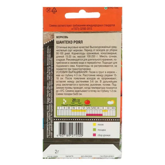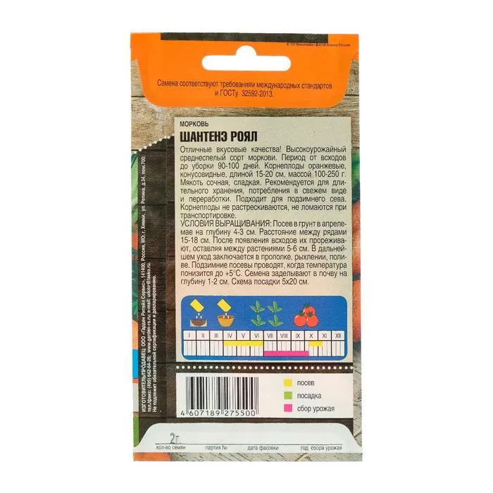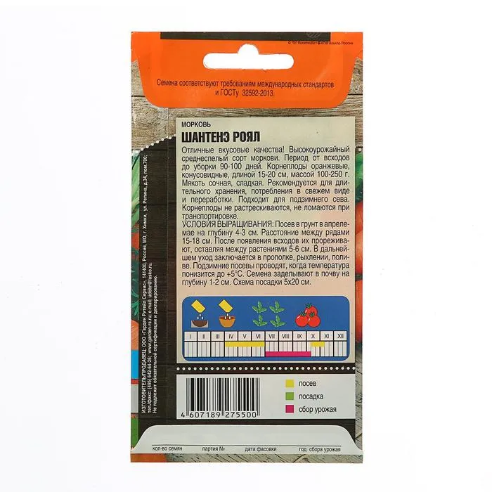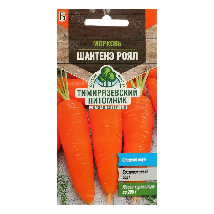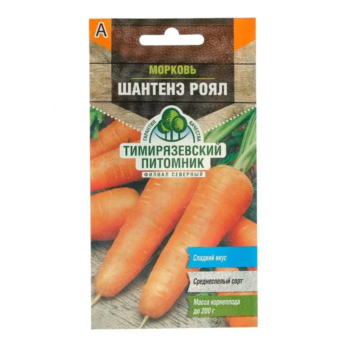 Среднеспелый (86-110 дней от всходов до технической спелости) сорт. Выращивают посевом в открытый грунт на глубину 1 см. Лист длинный, зеленый, с мелкой рассеченностью. Корнеплод короткий, конический со слегка заостренным кончиком (сортотип Шантенэ), головка слегка выпуклая до ровной. Сердцевина и кора оранжевые. Масса 110-200 г Сорт характеризуется повышенным содержанием каротина и сахара, выравненностью корнеплодов. Рекомендуется для использования в свежем виде и длительного зимнего хранения. Урожайность 2,0-4,1 кг/м2.