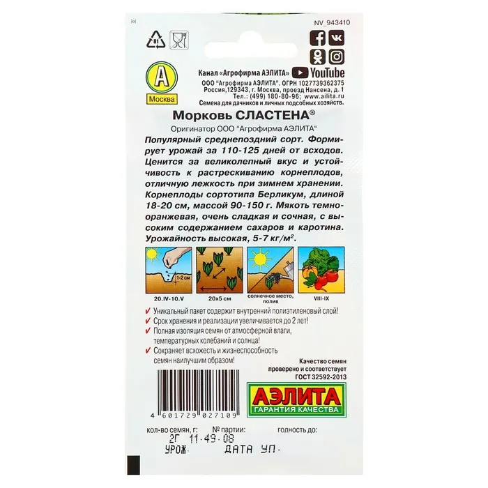 Cреднепоздний сорт. Период от всходов до технической спелости 110-125 дней. Корнеплоды цилиндрические, тупоконечные (сортотип Берликум), длиной 18-20 см, массой 90-150 г. Мякоть оранжевая, очень сладкая и сочная, с высоким содержанием сахаров и каротина. Для использования в свежем виде, консервирования, замораживания, зимнего хранения. Сорт устойчив к цветушности и растрескиванию корнеплодов. Урожайность высокая, 5-7 кг/м2.