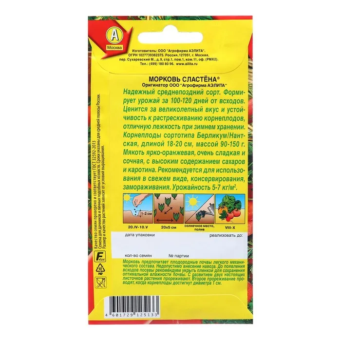 Относится к группе раннеспелых гибридов. Отличается высокой урожайностью как в период сбора ранней продукции (3 декада июля – 1 декада августа), так и в основной срок сбора урожая в сентябре. Характеризуется высокой экологической приспособленностью к выращиванию в Сибири, так как получен на основе местного селекционного материала с повышенной адаптивностью к сибирским условиям. Корнеплоды удлиненно-цилиндрической формы со слабым сбегом к основанию до 25 см, с ярко-красной нежной мякотью. Имеют высокие показатели содержания каротина и сахаров, что придает корнеплодам изысканно-сладкий, нежный вкус.