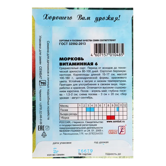 Семена Морковь "Витаминная 6", 1 г — Характеристики