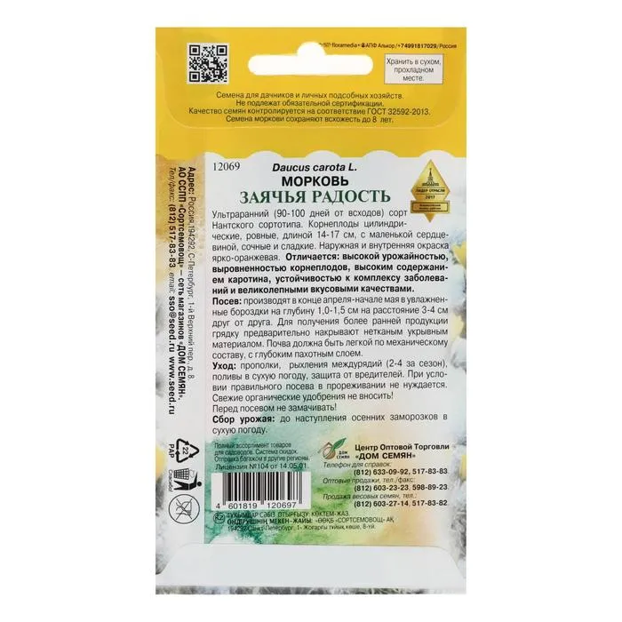 Ультраранний (90-100 дней от всходов) сорт Нантского сортотипа. Корнеплоды цилиндрические, ровные, длиной 14-17 см, с маленькой сердце виной, сочные и сладкие. Наружная и внутренняя окраска. ярко-оранжевая. Отличается: высокой урожайностью, выровненностью корнеплодов, высоким содержанием каротина, устойчивостью к комплексу заболеваний и великолепными вкусовыми качествами.