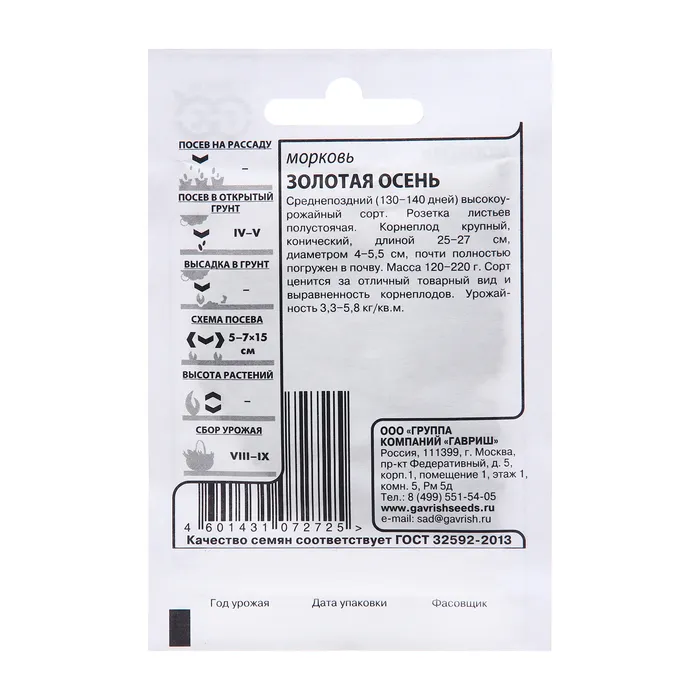 Семена Морковь "Золотая осень", 2,0 г б/п — Характеристики