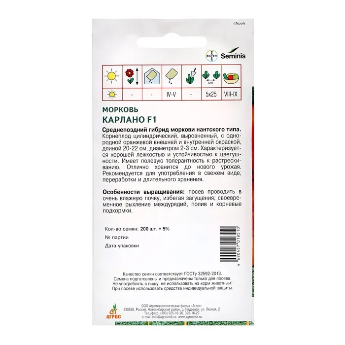 Семена Морковь"Карлано"F1 200шт* ЭКОНОМ — Характеристики