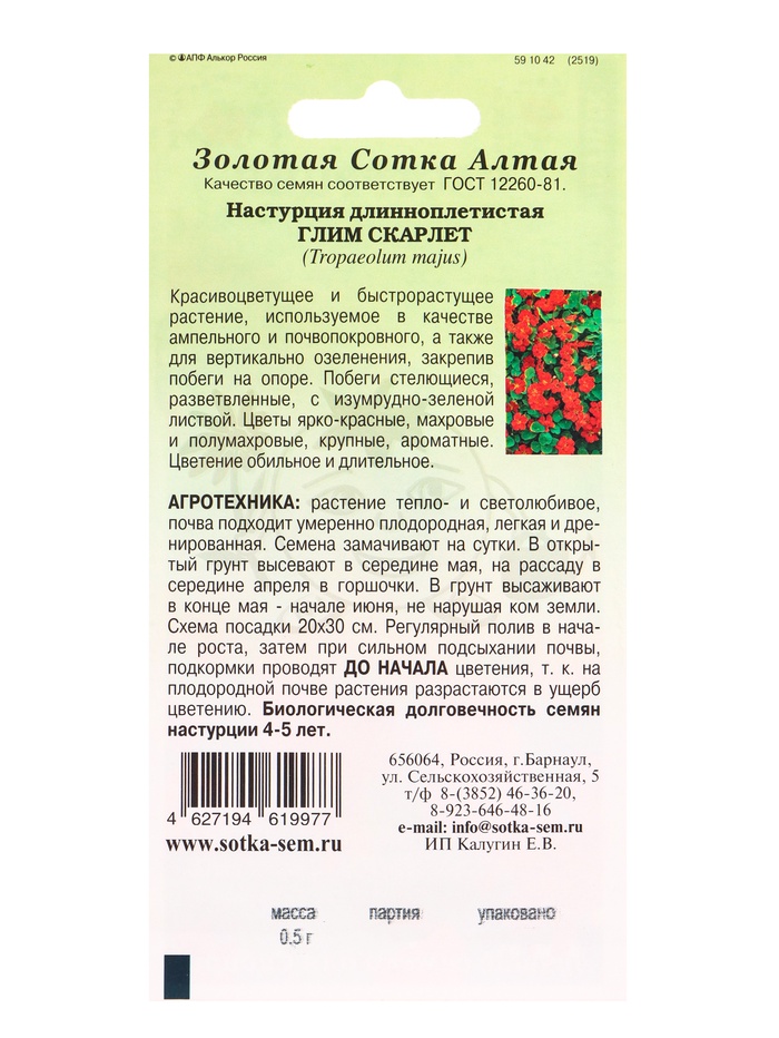 Семена Настурция «Глим Скарлет», 0.5 г, «Золотая Сотка Алтая» — Характеристики