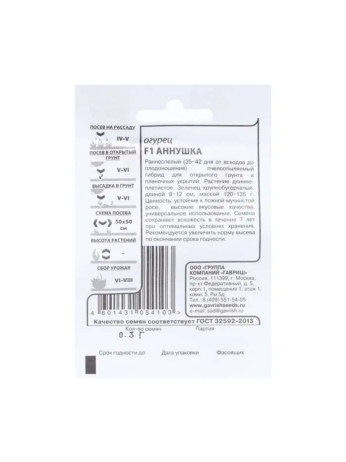 Относится к классу пчелоопыляемых раннеспелых гибридов. Растение женского типа цветения. Отличается пучковым типом формирования завязи. По форме зеленец цилиндрический, среднебугорчатый, ребристый, с беловатым опушением. На характерной темно-зеленой окраске присутствуют короткие полоски и прослеживается нечеткая пятнистость. В диаметре плод достигает 3–3,5 см. В длину плод 8-12 см. Вес одного зеленца 120-135 г. Гибрид широко используется для консервации и употребления в виде салатов.